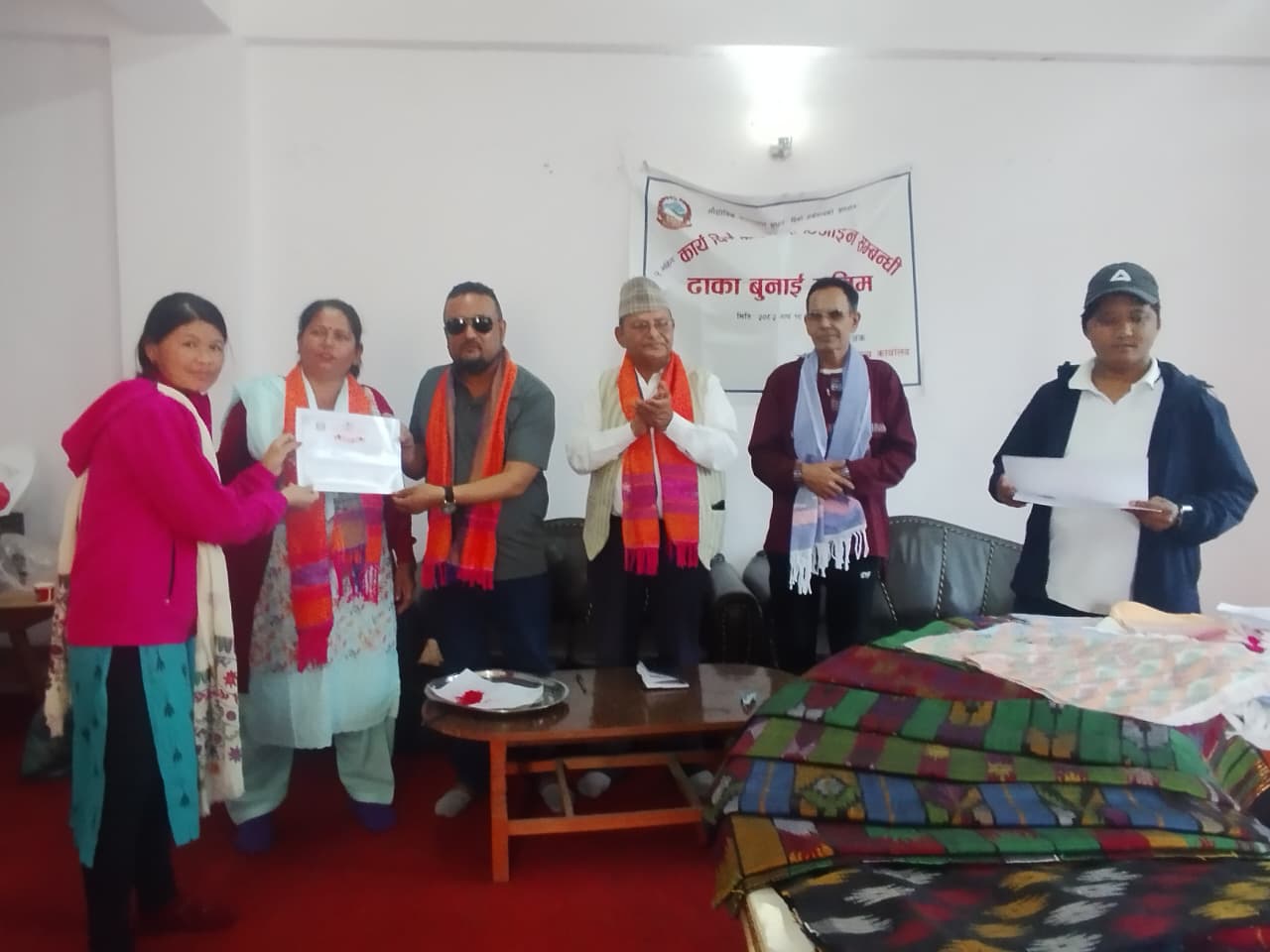मिति २०८२/१०/१९ देखि २०८२/१२/२२ सम्म सीप बिकास कार्यक्रम अन्तर्गत सञ्चालित 2 महिने एडभान्स डिजाइन सम्बन्धित ढाका बुनाई तालिम यसै कार्यालयका प्रमुख श्री सिताराम घिमिरेको अध्यक्षता तथा विदुर नगरपालिकाका वडा न ४ का वडाध्यक्ष श्री निलमबाबु ढुङ्गेलको प्रमुख